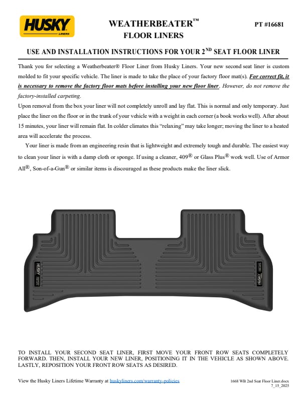 - WeatherBeater(TM) Liners offer protection that extends all the way to your rear seats. So go ahead, lift the seats and leave them up, load after load. Husky's got your floors, and your back, no matter what the road brings your way.