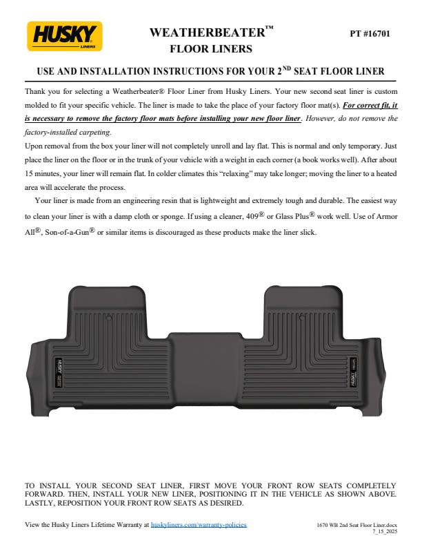 - WeatherBeater(TM) Liners offer protection that extends all the way to your rear seats. So go ahead, lift the seats and leave them up, load after load. Husky's got your floors, and your back, no matter what the road brings your way.
